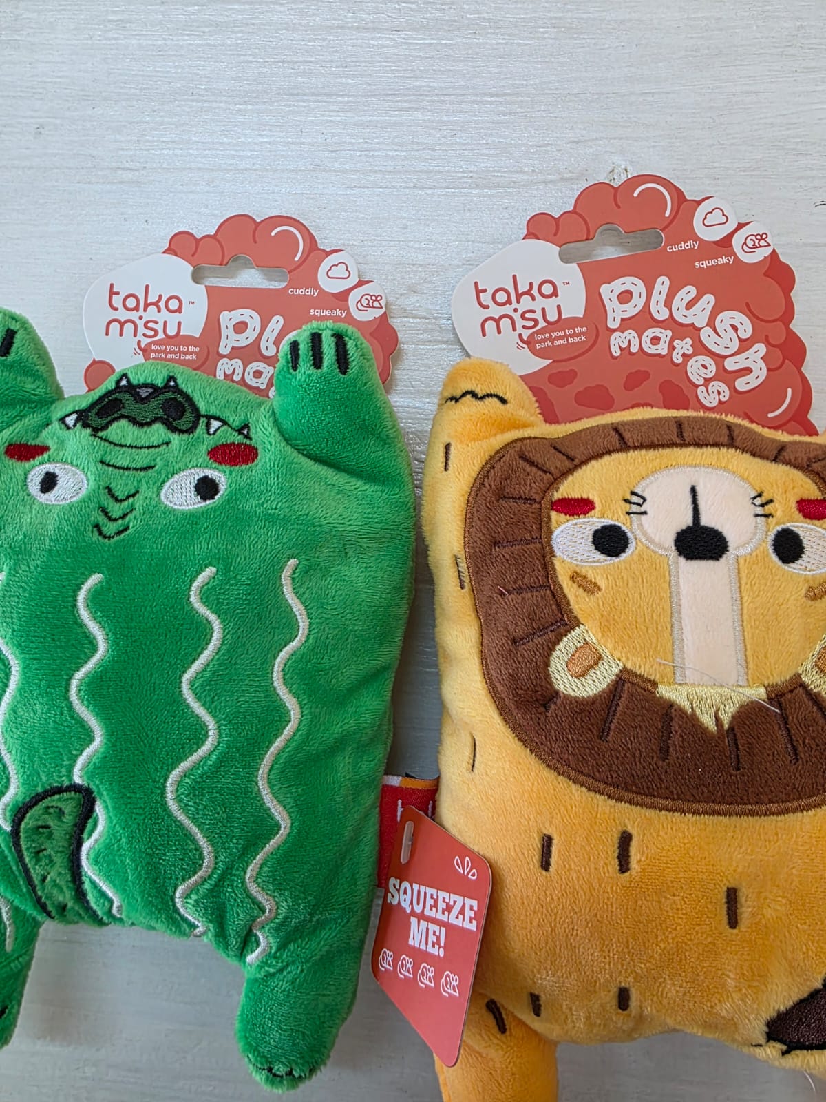 Takamisu Plush Mates Squeaky Dog ToyBright, fun and super cuddly, the Takamisu Plush Mates range is the perfect soft dog toy for playtime and snuggle time. These plush squeaky dog toys come in two adorable characters, cheeky crocodile and friendly lion, with bold colours that are easy for your dog to spot.
